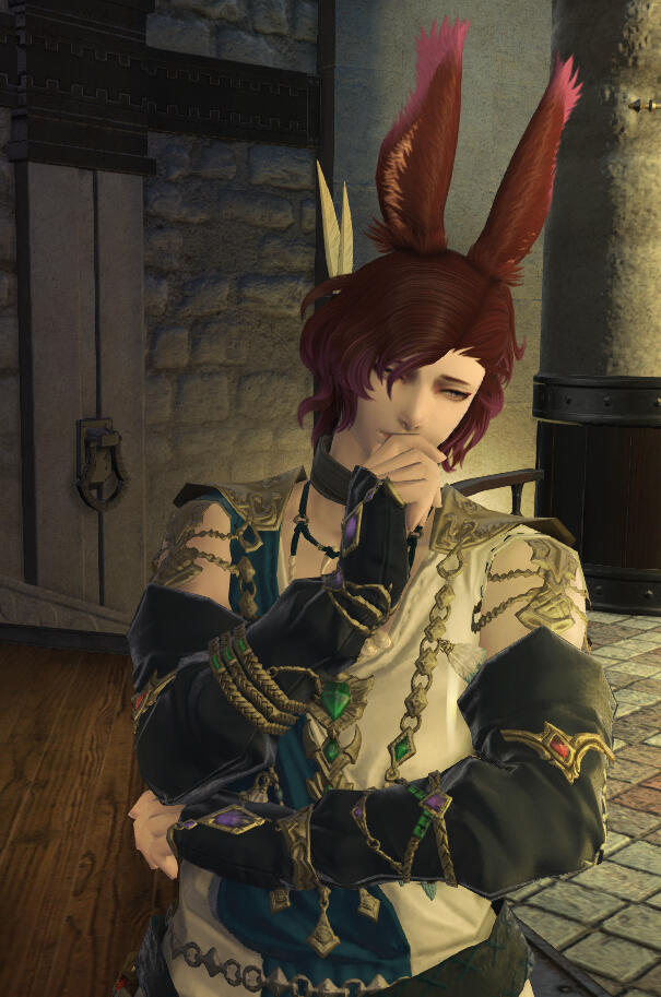Occasionally, in a good mood, he'll situate himself in a bar corner or comfortable bench and play a tune on a small harp and sing an old Coerthan or Ishgardian folk song or tell a familiar children's fairy tale. Maybe you stopped to listen.